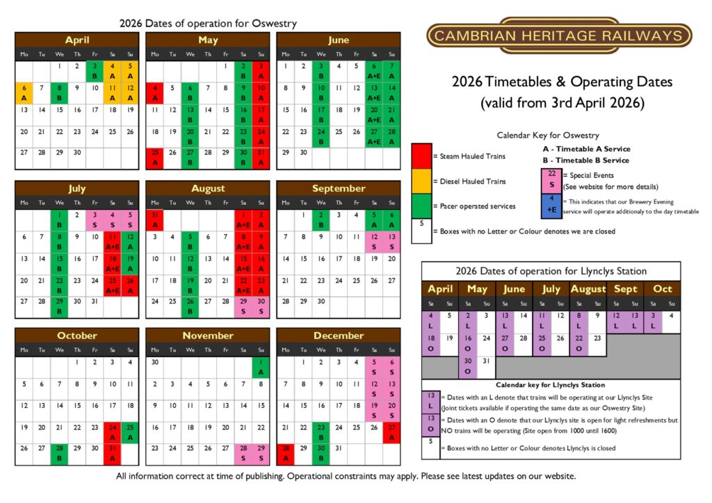 2026 Cambrian Heritage Railways Timetable & Operating Dates